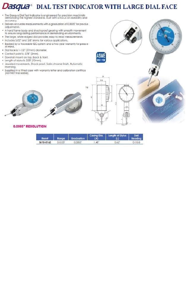 Dasqua 0-.03" White Large Face 0-15-0 Dial Test Indicator. The Dasqua Dial Test Indicator is engineered for precision machinists demanding the highest standards, built with a focus on durability and accuracy. Delivers accurate measurements with a graduation of 0.0005" for precise adjustments. A hard frame body and shock-proof gearing with smooth movement to ensure long-lasting performance in demanding environments. The large, white-edged dial provides easy-to-read measurements. Includes 5/32" and 3/8" stems for various applications. Backed by a traceable QC system and a two-year warranty for peace of mind. Dial face is 1-1/2" diameter (37mm). Contact point is .078" (2mm). Dovetail mount on top, back and front. 5/32" and 3/8" stems are included. Length of stylus is .53" (13mm). Jeweled movements. Shock proof. Satin chrome finish. Automatic reversing. Supplied in a fitted case with warranty letter and calibration certificate (not NIST traceable - see picture).