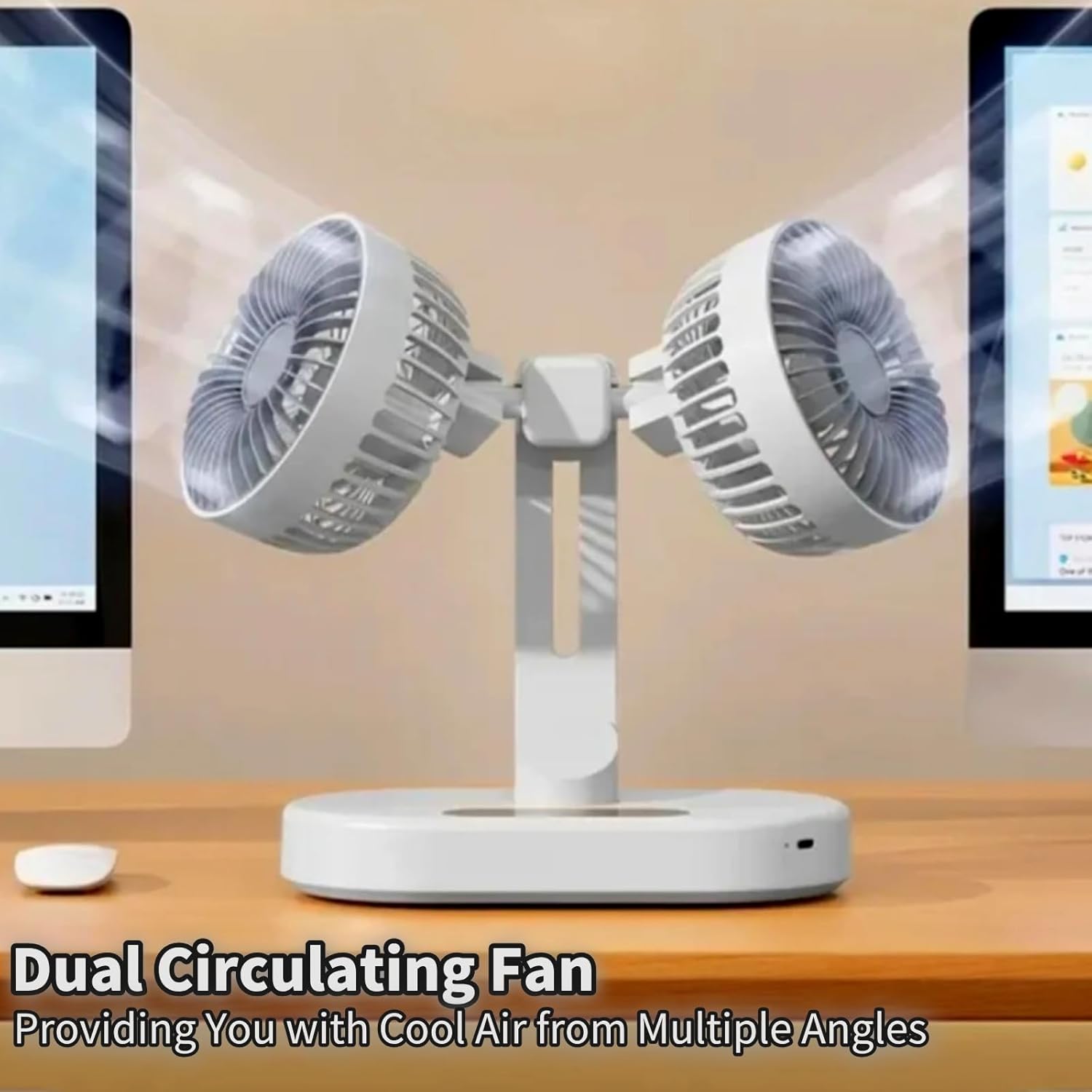 Tabletop Air Circulator Fan for Home OfficeTake control of your comfort with the 6-speed rotary dial on this high-velocity room fan. Fans for bedroom and home are an easy way to cool down any space and improve airflow.Help improve cooling and energy savings in your home, bedroom or office using a double head fan.Product Specification:Input power: 5V/2ABattery capacity: High Capacity Lithium BatteryRated power: 6WEndurance: 2-2.5HCharging time: 1-2 hoursWind speed:6 speedsCharging port: Type-C charging portTiming function: 9 levelsPackage Included:1x Table Fan1x User Manual1x USB Charging Cable
