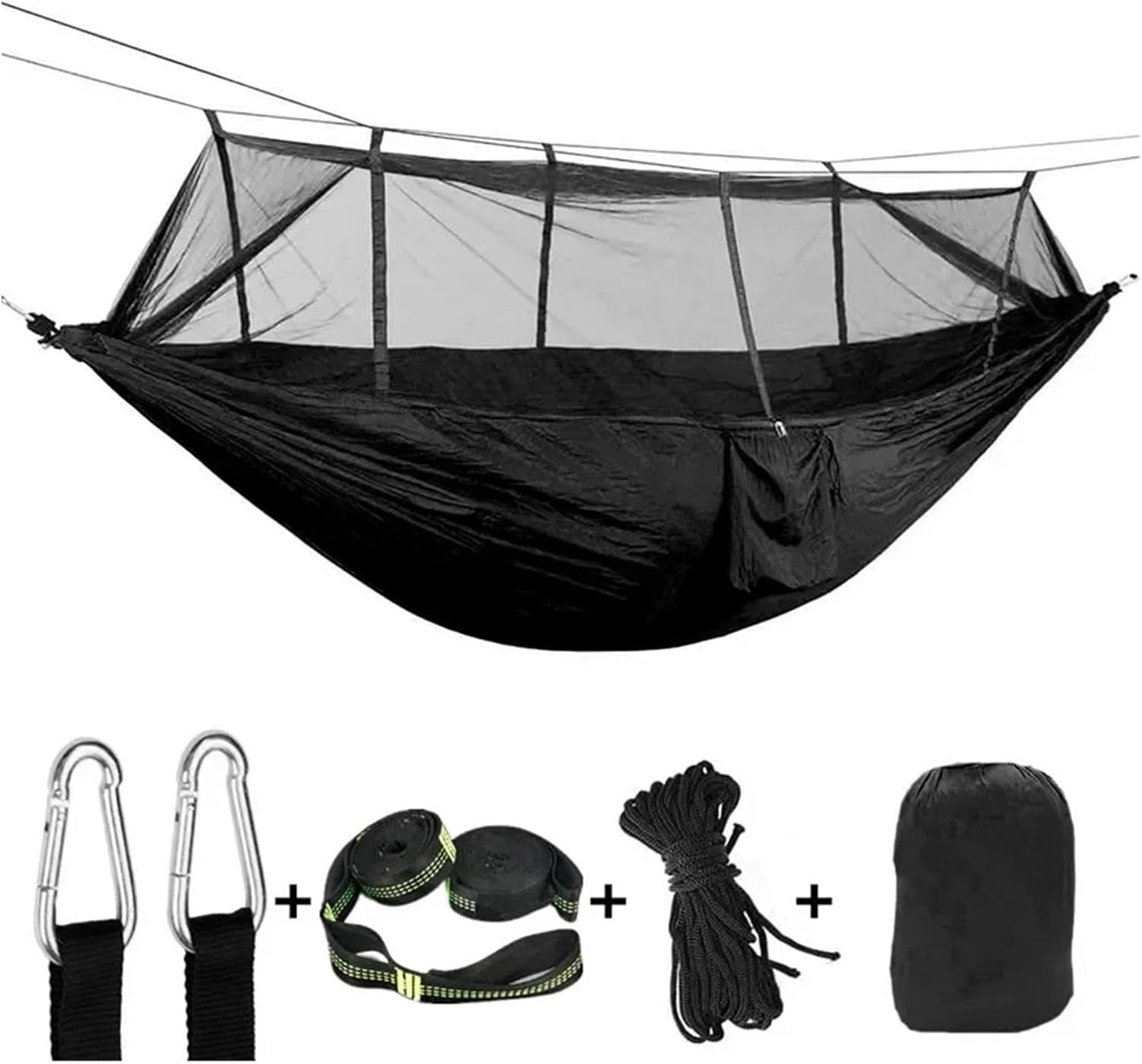 Product descriptionOutdoor Camping Portable Hammock with Mosquitonet, Lightweight Swing Hanging Chair for Indoor,Hiking,Backpacking,Travel,BackyardProduct descriptionAnti Mosquito Hammock for Camping - Mosquito net for tent / hammock tent adopts high density polyester, which could effectively prevent mosquitoes flying into the portable hammock tent and provide campers or hikers a quite and comfortable sleeping or relaxation. The camping mosquito net for hammock connected with the hammock by quality stainless steel zippers.Strong Safe Hooks & Straps The outdoor hammock mosquito net for tent comes with 2 hooks and 4 straps which used to hang the camping tent with mosquito net Both the hammock straps and hooks are strong and durable not easily to be broken. For safety, please hang the mosquito net for tent on the main branch of strong trees in flat place such as backyard and garden. It is better that the tent hangs not to exceed 50cm from the ground.Indoor Or Outdoor Use Hammock - Many of our customers use these Hammocks indoors as a permanent bed replacements and swear they lead to deeper, more restful sleep (often helping alleviate back pain). Others prefer to use them as outdoor Hammocks in the Backyard or on the Porch.Portable & Lightweight Design The storage bag can both accommodate hammocks and carry small items that you can carry with you When you dont use the hammocks, you only need to close them and put them in the storage bag that is connected to the hammock. The hammock weighs only 26 ounces. Humanized design, easy to use and comfortable.A Great Lounge Bed Travel Partner - Mosquito nets and hammocks combined, keep you well away from its harassment. It is like your close friend, letting you put down the stress of work and enjoy nature.Whether you go camping, hiking, beach, park, courtyard, indoor or any other place, taking it will make your trip more comfortable and fun.Why choose our Hammocks?We use high q
