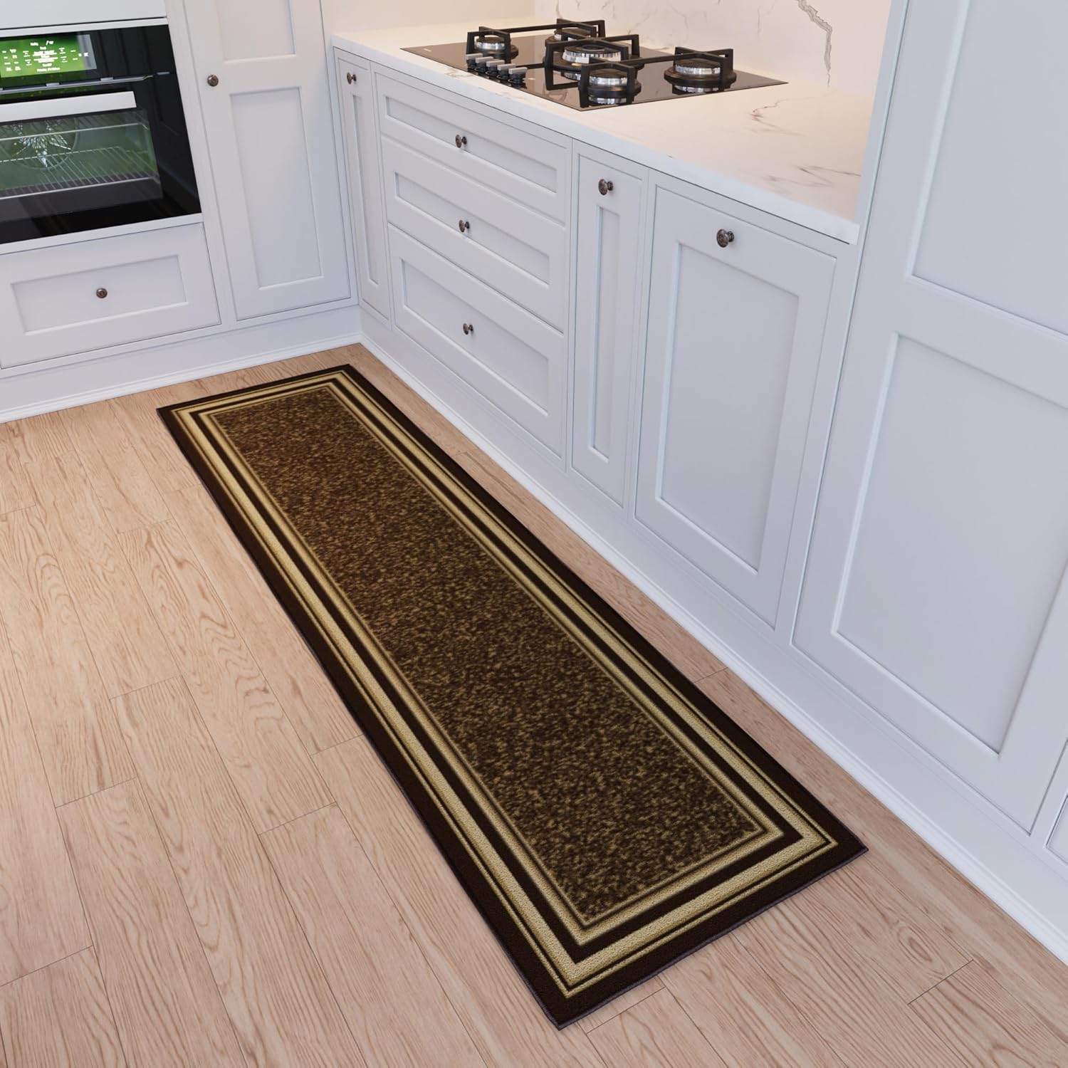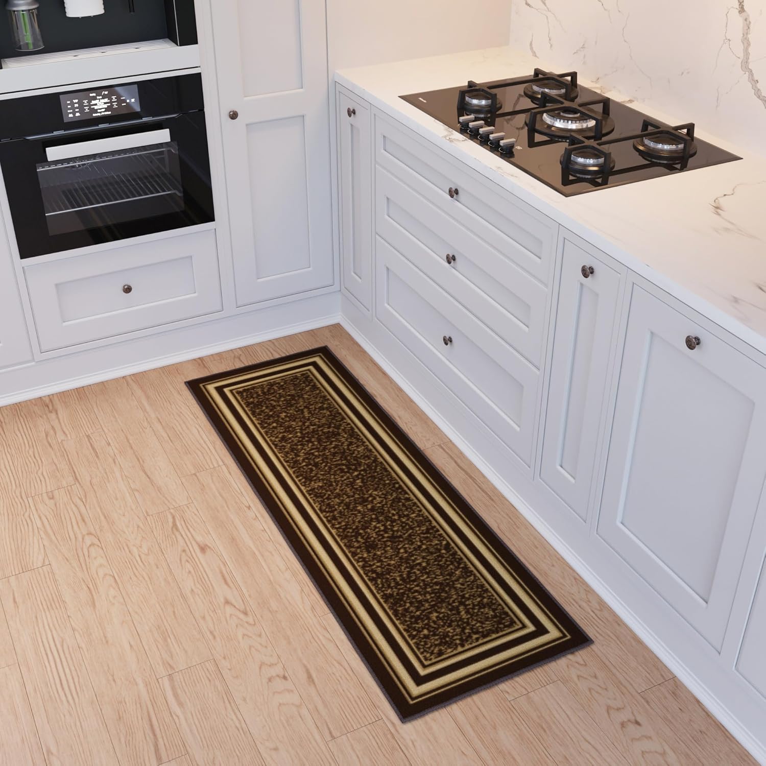 The Ottomanson Border Indoor Rug Collection is designed for homes that need practical rugs for everyday living spaces. With a classic framed border pattern, a low-profile surface, and a non-slip rubber backing, these rugs provide both style and functionality for areas that experience regular foot traffic.Looking for a runner rug for a hallway?Many customers choose the runner sizes in this collection for hallways, corridors, and narrow walkways where a long rug helps protect flooring while adding a finished decorative look.Need a kitchen runner rug for in front of the sink?Runner rugs in this collection are often placed along kitchen counters, in front of sinks, or between kitchen islands and cabinets where people frequently stand while cooking or washing dishes.Searching for a small entryway rug or indoor door mat?Smaller rug sizes work well inside front doors, mudrooms, and apartment entryways, helping catch dirt from shoes while keeping indoor flooring cleaner.Can this rug be used in living rooms or bedrooms?Yes. The area rug sizes in the collection can be used in living rooms, bedrooms, offices, or seating areas where a compact rug adds comfort and floor coverage.Will this rug work on hardwood or tile floors?Each rug includes a non slip rubber backing designed to help the rug stay in place on common flooring surfaces such as hardwood, laminate, tile, and vinyl.Is the rug thick or bulky?No. The rugs feature a low pile construction, allowing them to fit easily under doors and furniture while helping reduce tripping hazards in busy areas of the home.How do you clean the rug?These indoor rugs are easy to maintain with regular vacuuming and occasional spot cleaning, making them suitable for households with everyday foot traffic.The 1'10" x 6' size works well as both a kitchen runner and hallway runner, making it a versatile option for long kitchen layouts, laundry rooms, or narrow hallways.