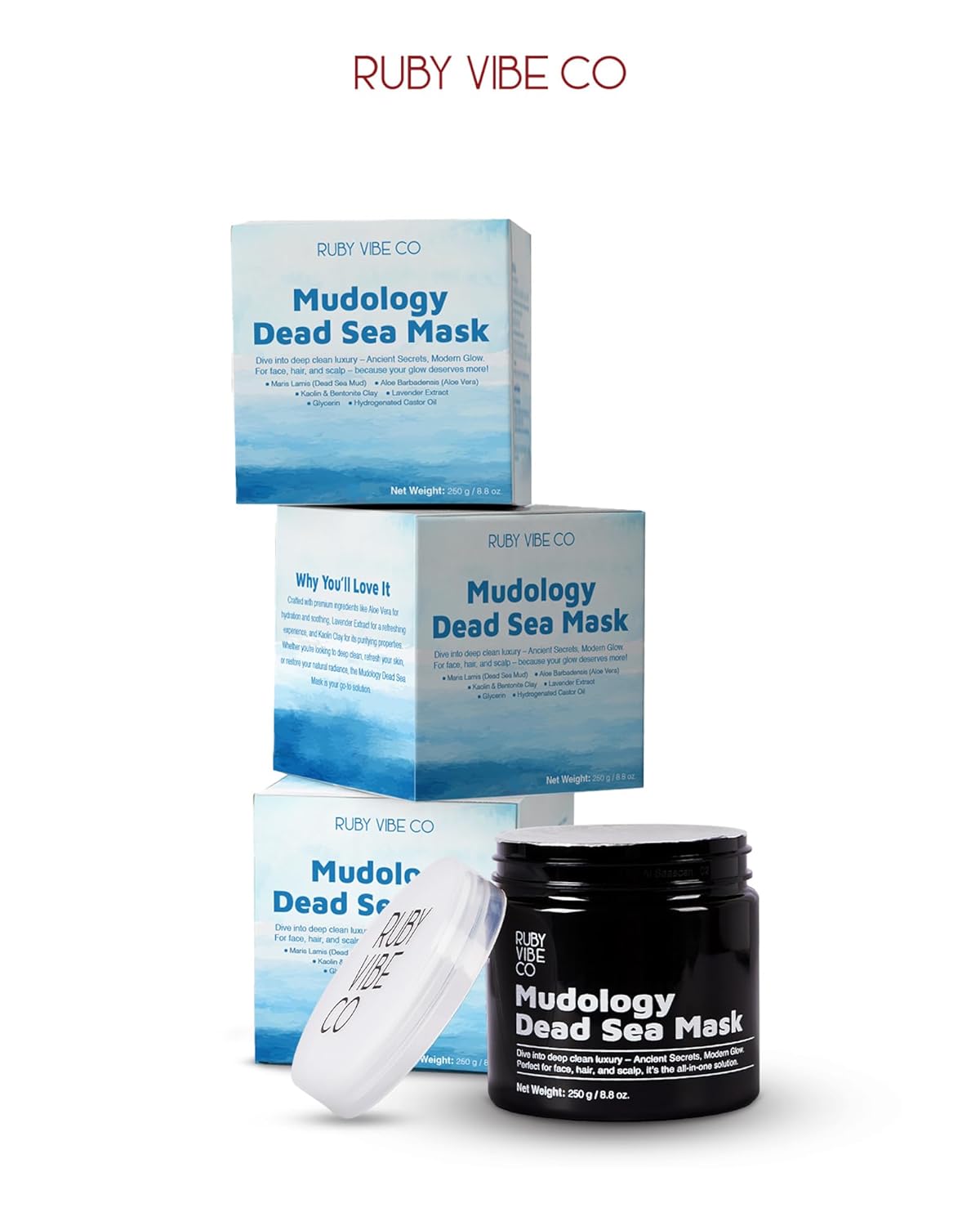 RUBY VIBE CO Mudology Dead Sea Mud Mask, Clay Mask for Face, Body & Hair, Deep Pore Cleansing, Detox & Oil Control for Smooth, Radiant Skin, 250g/8.8oz