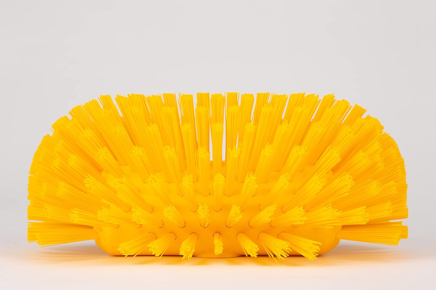 The SPARTA Plastic Tank, Kettle, and Tile Scrub Brush - your ultimate cleaning ally for commercial kitchens, restaurants, and industrial settings. Specifically designed for businesses operating with large tanks and kettles, this brush is built to address the unique challenges that come with cleaning such large equipment. Its distinctive flared head ensures thorough cleaning. Complementing the design is its material; crafted with durable Polypropylene (PP) and bolstered by a Polyester block, this brush head promises a robust cleaning session every single time. Furthermore, its nonabsorbent bristles are adept at resisting oils and moisture, ensuring that the scrubbing process is consistent and effective. One of its standout features is its adaptability. The brush is designed to be compatible with a variety of handle lengths (sold separately), ensuring that even the deepest tanks and kettles can be cleaned efficiently. And while the brush is tough on dirt, it's designed to be gentle on surfaces, making it perfect for alternative uses such as tiles. But what truly sets this brush apart is its color-coded system. Aligning with HACCP practices, this system ensures that there are no mix-ups during cleaning sessions. Each zone gets its dedicated color, ensuring a streamlined and efficient cleaning process, free from any mix-up concerns. Whether you're a commercial kitchen or an industry dealing with large tanks, SPARTA's Scrub Brush is the ideal addition to your cleaning arsenal. Its perfect blend of design, durability, and efficiency ensures that your equipment remains clean, ensuring a smoother operational flow.